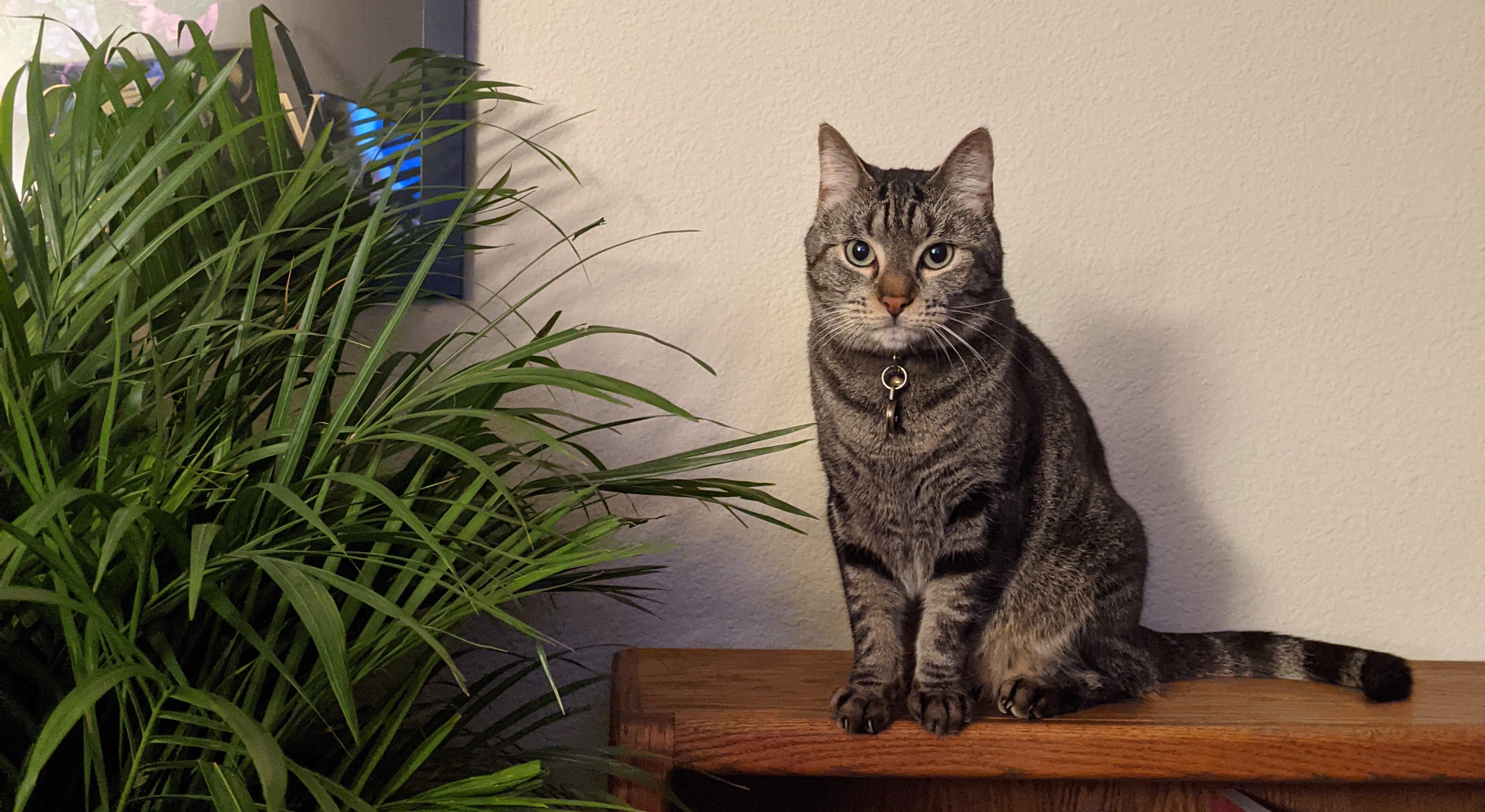 He only gets a spot on the site because he likes to "help" me. Either by yelling at me, scaring me when I have headphones in, or chewing my power cables where they meet the outlet. He simply will not stop helping.
